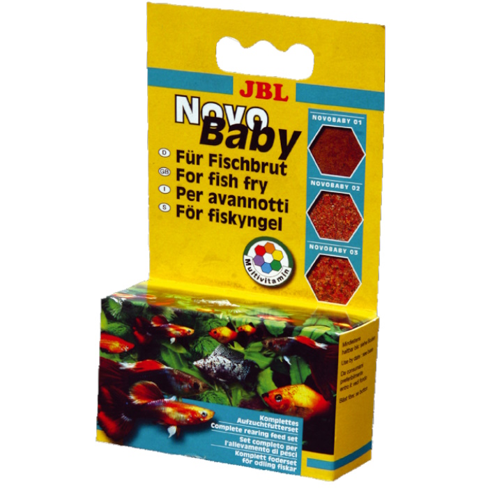 Complete nutrition and ideal growth: rearing food set for live-bearing fish species. Nutritious, easy to digest and strengthening the immune system thanks to vitamins and the biological trace element inosite. Ideal feeding conditions thanks to three foods and food sizes for the rearing of newborn live-bearing fish up to 30 mm in size in all water layers. No water clouding: reduced algae growth thanks to balanced phosphate content, better water quality due to better digestibility of the food, which reduces fish excrement. Fish choose JBL food: 98.5% of all fish species ate the JBL food immediately during research expeditions in freshwaters. No processing of cheap fish meal, fish meat from fish fillet production for humans is used Contents: NovoBaby, rearing diet set for aquarium fish.